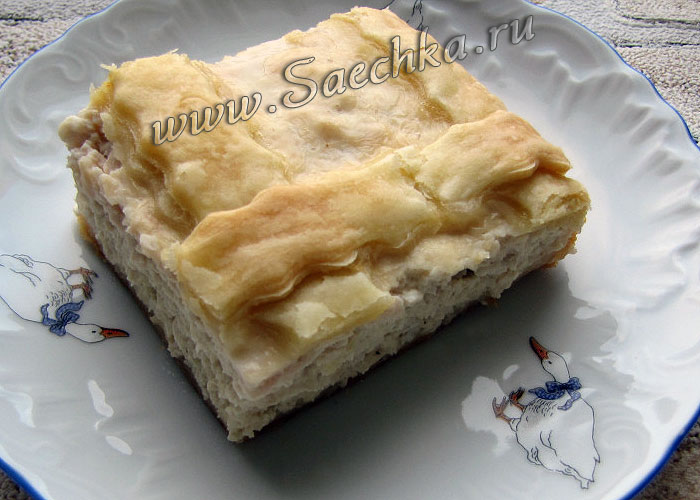 - Выпекать пирог с курицей в разогретой до 180 градусов духовке 30-35 минут, пока не зарумянится верх.