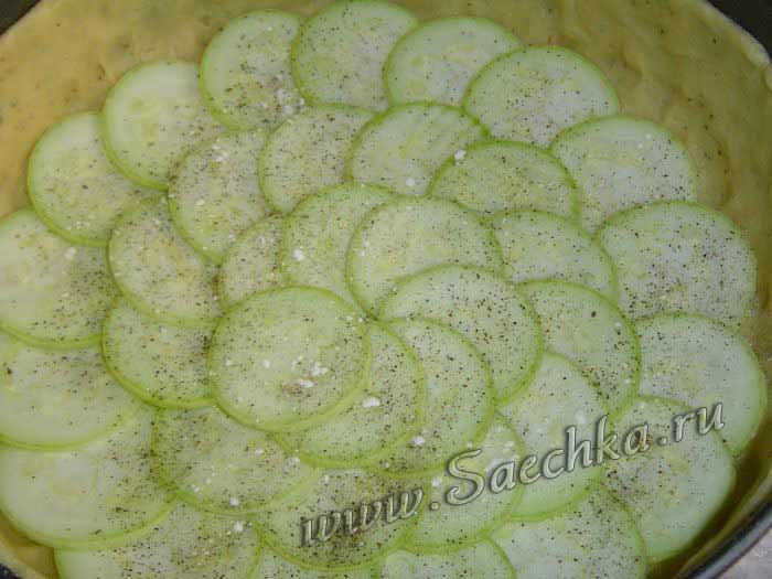 - Выложить нарезанный кружочками кабачок. Посолить поперчить по вкусу.