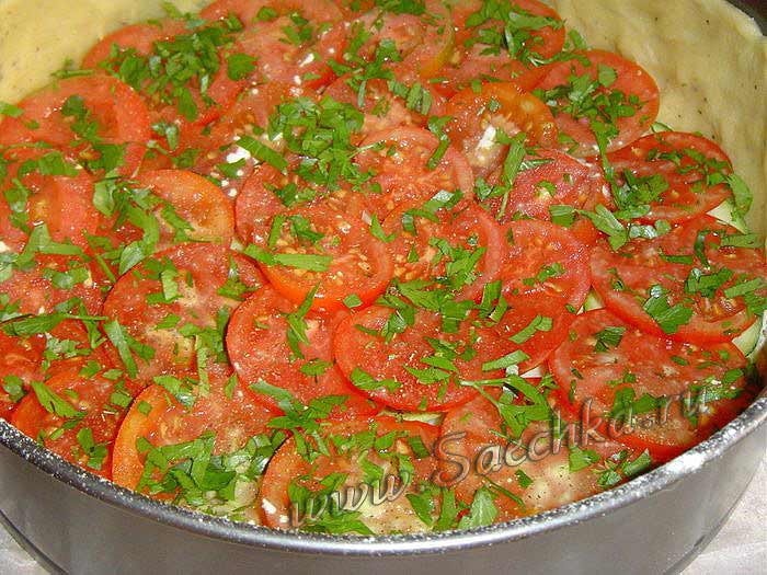 - Далее нарезанные кружками помидоры и измельченная зелень: