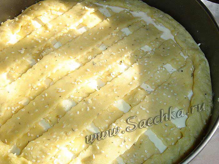 - На доску высыпать кунжут, сверху выложить оставшееся тесто. Раскатать и нарезать полосками. Выложить сверху на овощной пирог в виде решетки.
