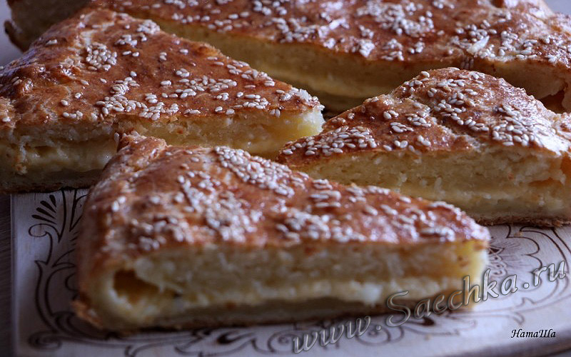 Творожный пирог приготовлен с сырной начинкой. Очень вкусно с красным вином.