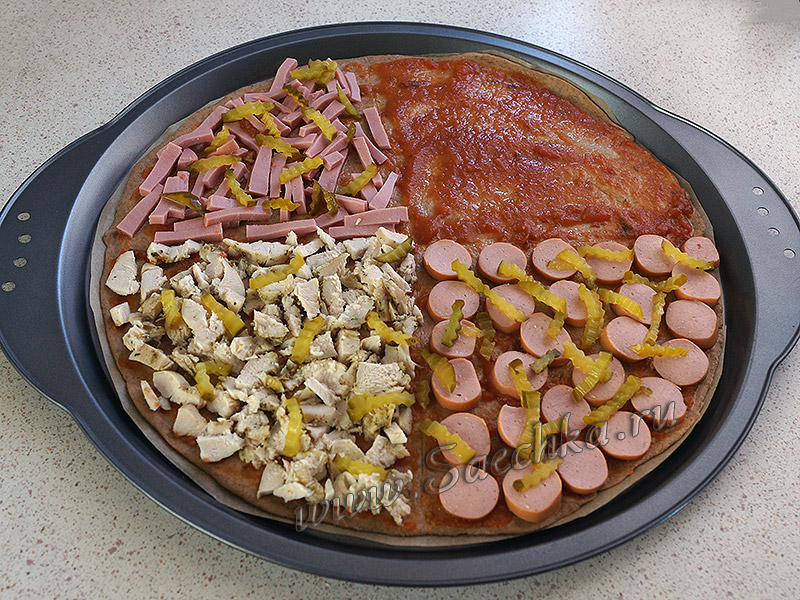 - Т.к. у нас кто какую пиццу любит в семье, решила поделить на 4 сектора и разделила начинки следующим образом: