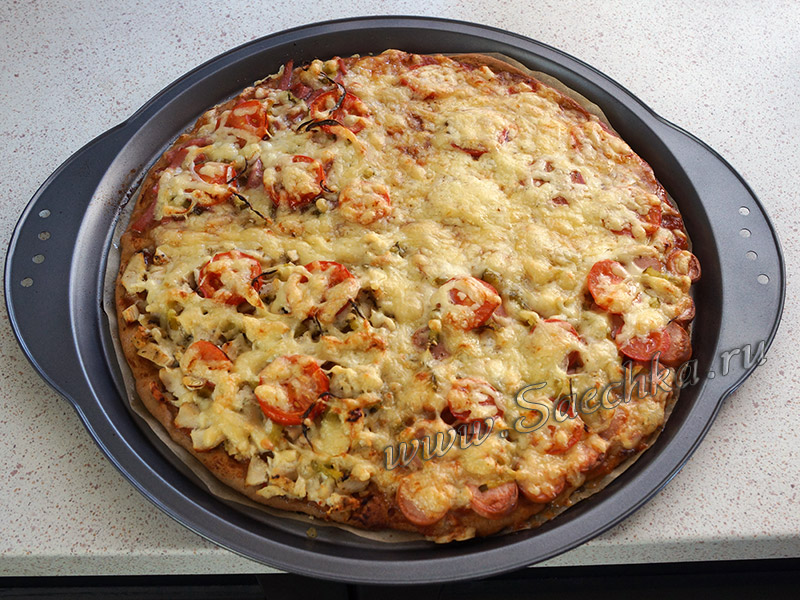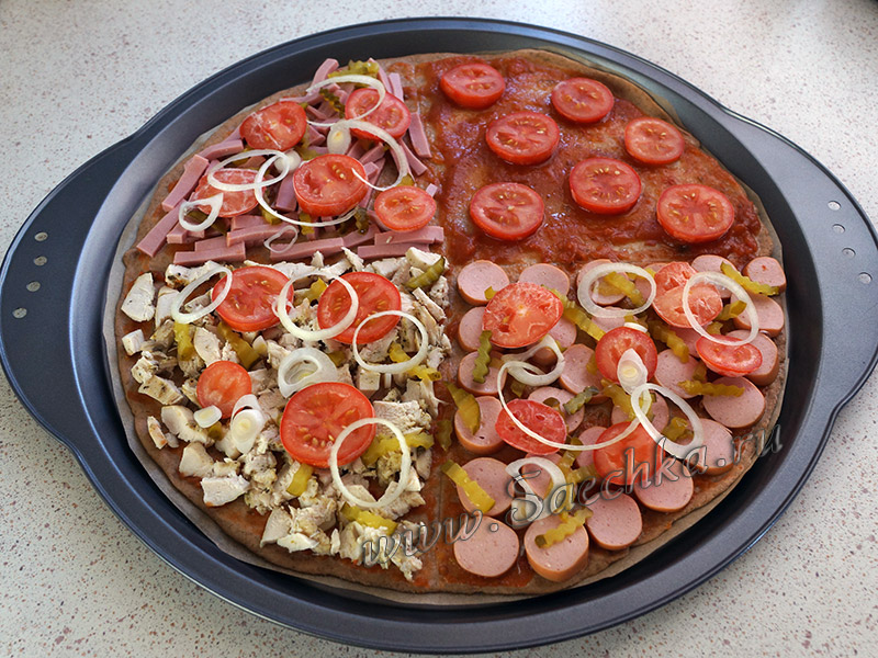 Домашняя пицца приготовлена на ржаном тесте с 4 разными начинками: классическая «маргарита», с курицей, колбасой и сосисками.