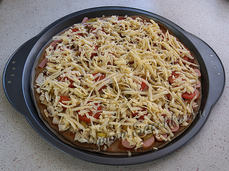 - После замеса тесто вытащить, раскатать по форме и смазать кетчупом.