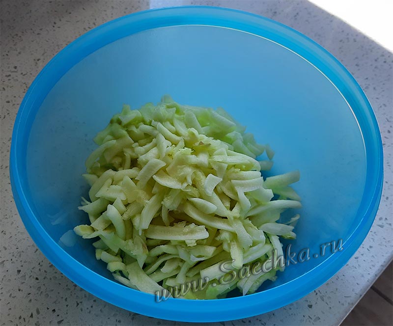 - Примерно половину кабачка натёрла на крупной тёрке с помощью комбайна.