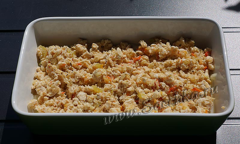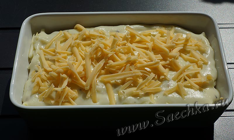 - Тут было б неплохо в серединку добавить обжаренные баклажаны или грибы, но первые не выросли ещё на огороде, а за вторыми лень было в магазин ехать. Поэтому вылила остатки бешамеля и выложила натёртый на крупной тёрке сыр.