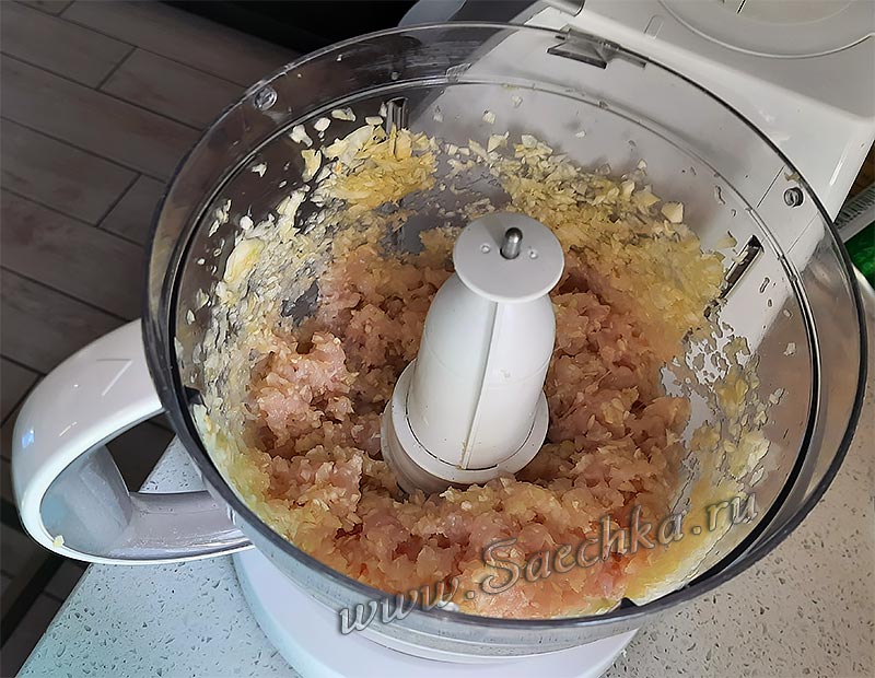 - Остальной кабачок вместе с луком и чесноком измельчила с помощью комбайна. Добавила курицу. Я люблю рубленый фарш, поэтому долго не промалываю.