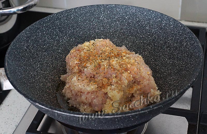 - На оливковом масле (1 ст.л.) до изменения цвета обжарила фарш с овощами, добавив прованские травы, карри, чёрный перец и соль.