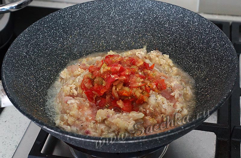 - С помощью всё того же комбайна измельчила помидоры черри и положила их к фаршу. Потушила минут 10.