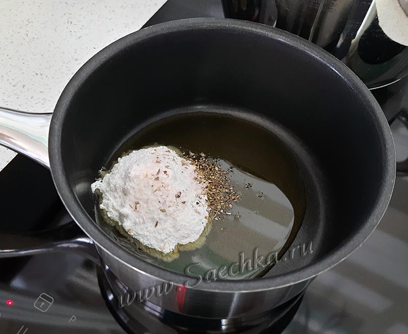 - Для соуса бешамель на оливковом масле обжарила рисовую муку с орегано и солью: