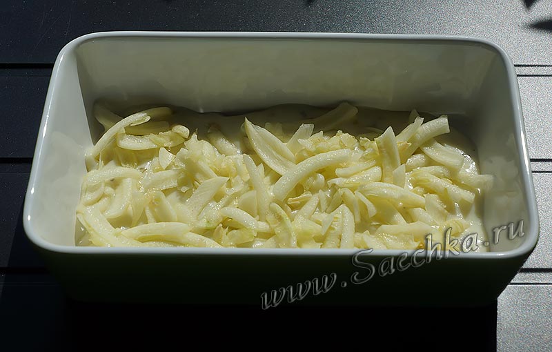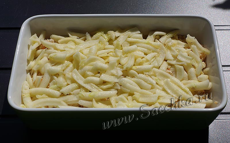 - Ну и осталось только собрать лазанью: на дно налить половину соуса бешамель и выложить половину натёртого кабачка. Слегка присолить.