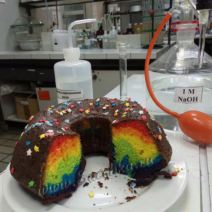 Радужный кекс приготовлен из цветного теста на день химика.