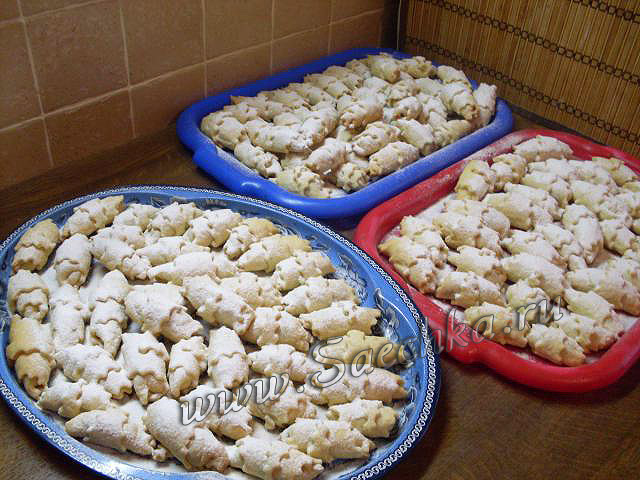 - Еще горячими посыпаем рогалики сахарной пудрой. Не жалеем, но и не теряем разума - лишнее все равно осыпется.