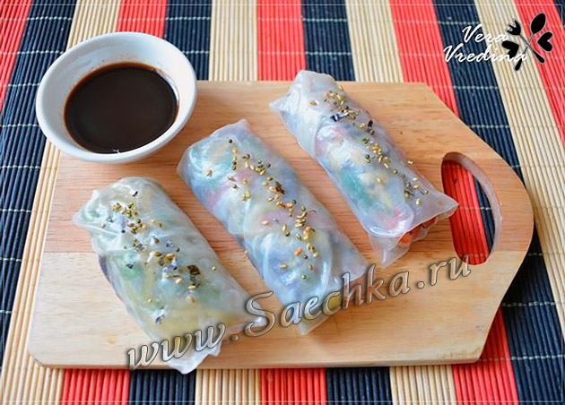 - Сверху посыпать роллы из рисовой бумаги обжаренными семенами кунжута или фурикакэ (сухая приправа из засушенной измельчённой рыбы, семян кунжута, водорослей, сахара, соли).