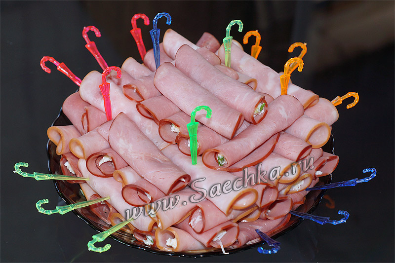 - В каждый кружочек ветчины выложить немного сырной начинки и свернуть его рулетиком. В этот раз у меня была очень тонко нарезанная ветчина, поэтому шпажками или зубочистками скреплять не пришлось.