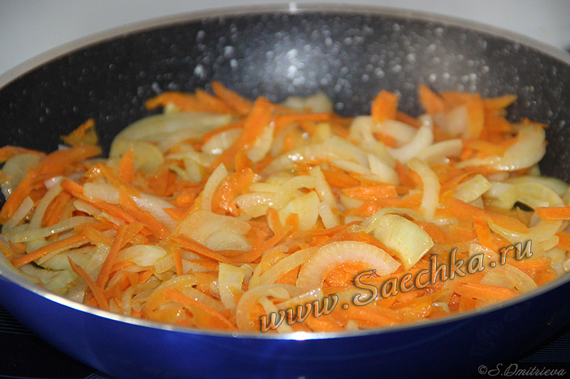 - Затем нарезала полукольцами лук и натёрла на крупной тёрке морковку. Обжарила морковку с луком на сковородке с небольшим количеством подсолнечного масла.