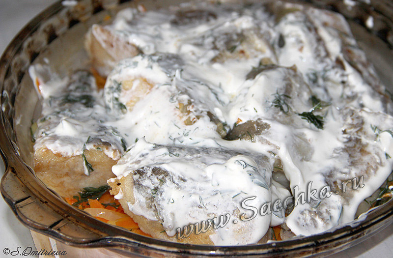 - Сверху посыпала укропом, у меня есть замороженный в морозилке. И смазала кусочки рыбы сметаной.