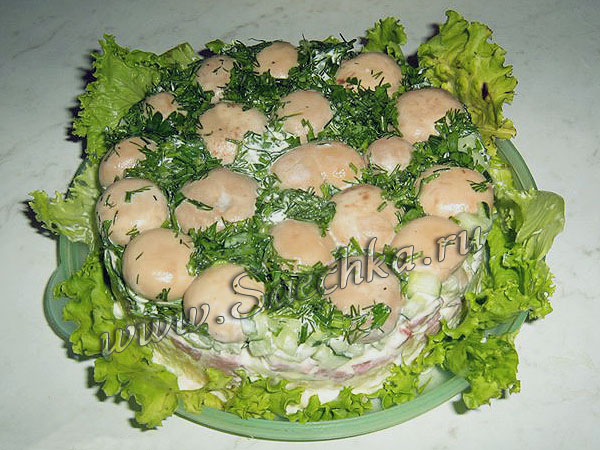 Салат «Грибная полянка» приготовлен с шампиньонами, ветчиной и свежим огурцом, что придало салату «Грибная поляна» сочность и аромат свежести.
