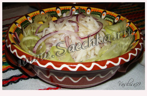 - Посолила, добавила тонко нарезанный полукольцами лук и заправила ароматным маслом.