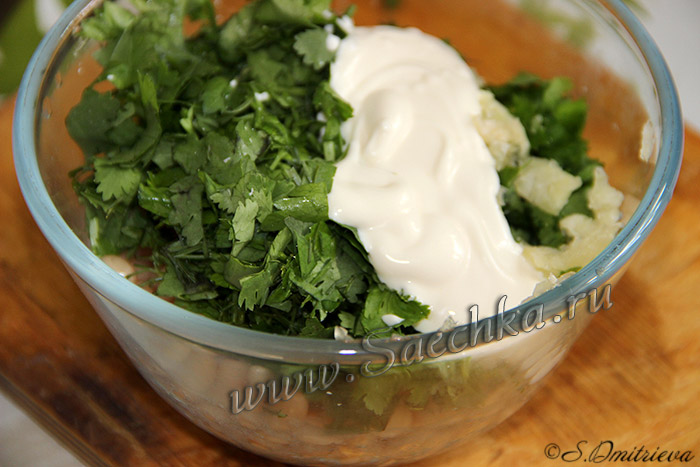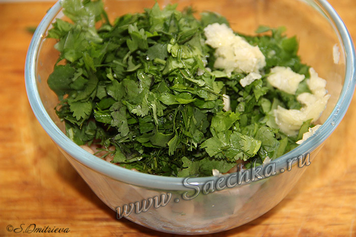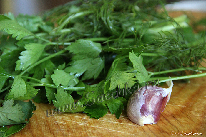 - Сверху - нарезанную зелень и выдавила зубчик чеснока.