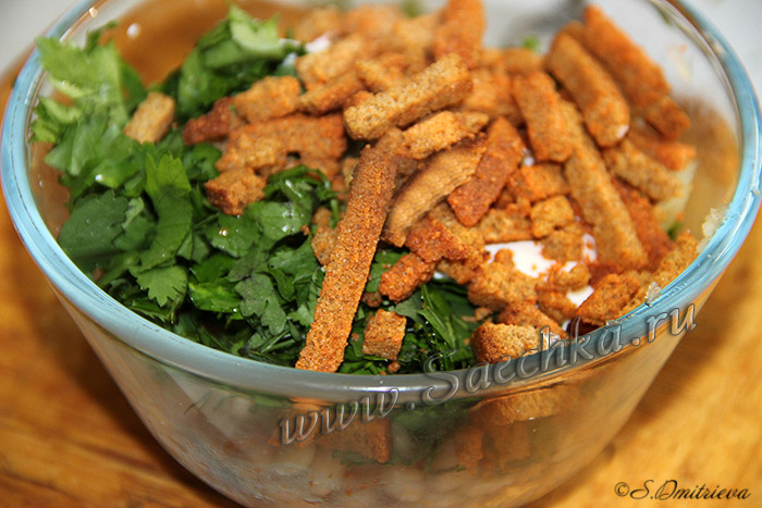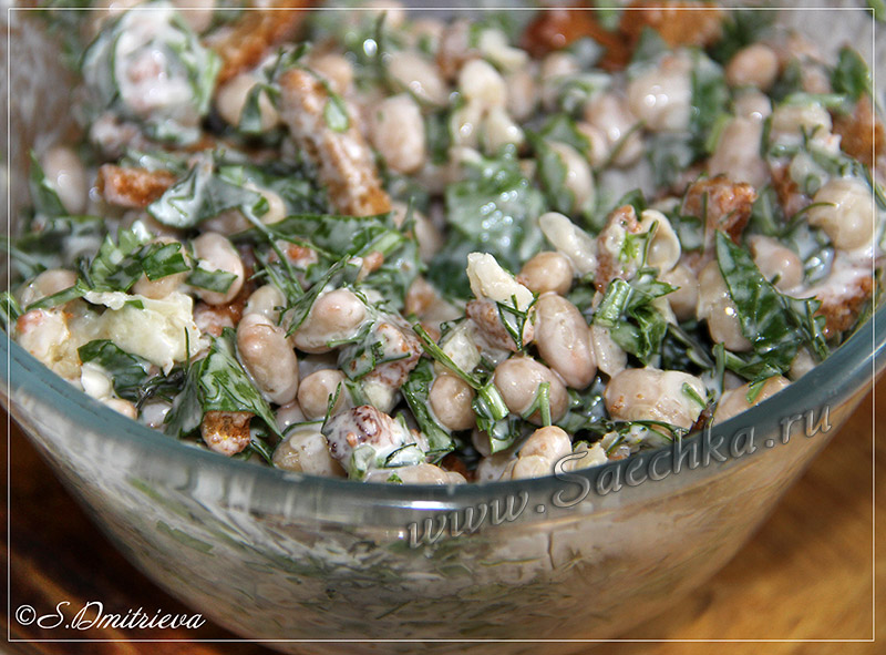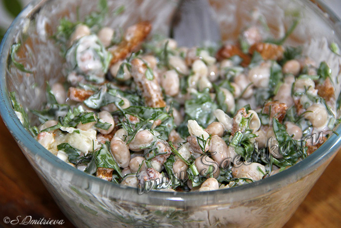 - Перемешала фасолевый салат с сухариками и сразу можно его кушать.