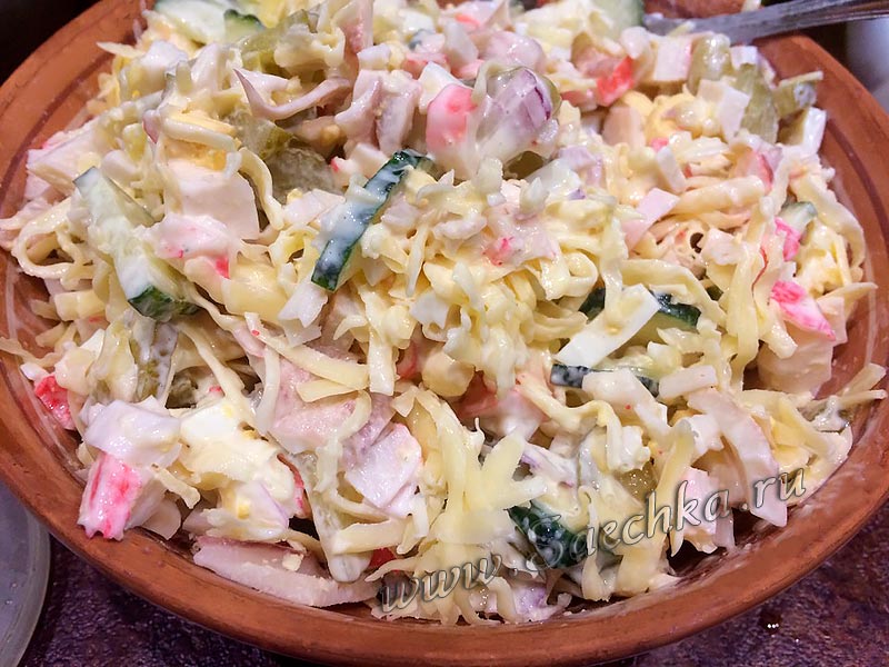 Салат с кальмарами, крабовым мясом, свежими и маринованными огурцами необыкновенно вкусен! Рекомендую к приготовлению!