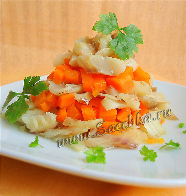 - Рыбу отвариваем в соленой воде, очищаем от кожицы и костей, разбираем кусочками, смешиваем с ломтиками вареной моркови, выкладываем слоями.