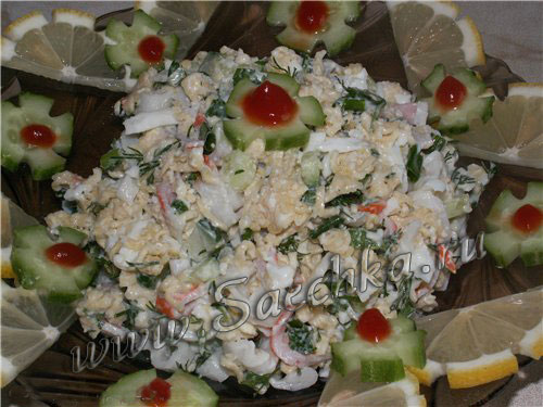 - Крабовые палочки порезать, яйца измельчить, мелко порезать зелень, огурец порезать небольшими кубиками.