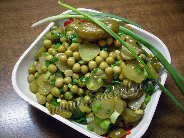 - Режем кружочками огурцы. И смешиваем с горошком.