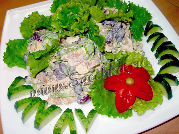- Банки горошка и фасоли вскрыть (жидкость слить, фасоль при необходимости промыть).