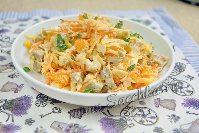 Сочетание сладости апельсина (мандарина) и остроты корейской морковки необычно приятно. Люблю такое! Мясо, кукуруза и сыр дают сытность. Отличный праздничный салатик для худеющих. И вкусно, и сочно, и сытно, и по калориям очень демократично!