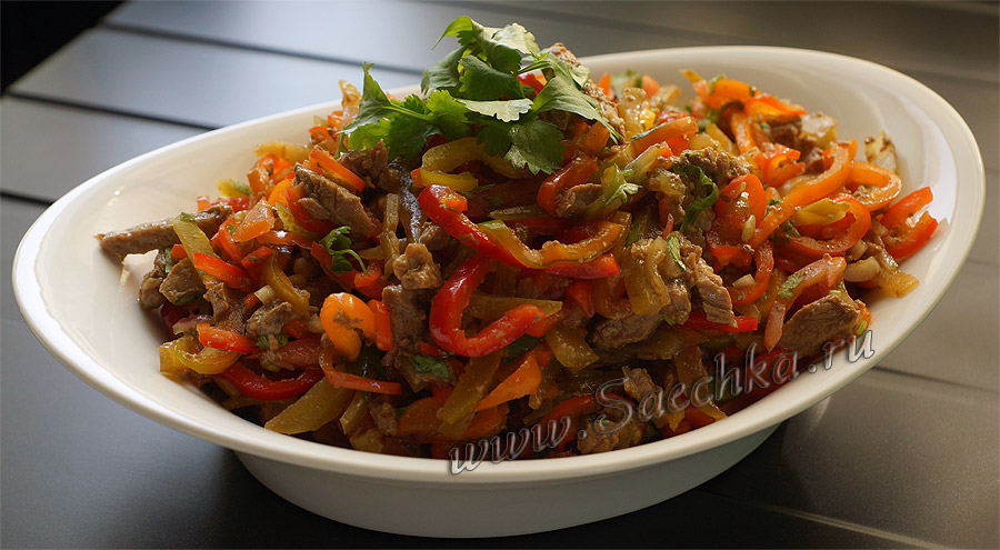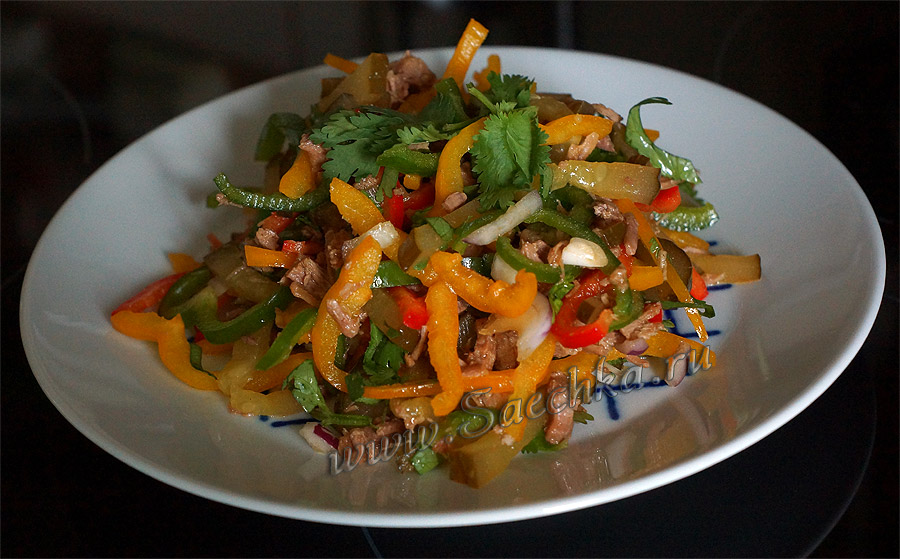 - Овощной салат с говядиной и кинзой заправить соевым соусом и оливковым маслом. Дать ночь постоять в холодильнике, чтобы говядина хорошо пропиталась соком овощей.