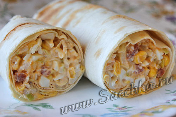 - Завернуть получившийся салат в лаваш. Порционно нарезать.