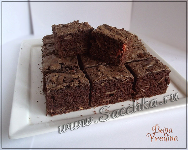 Шоколадный брауни приготовлен из тёмного шоколада с миндалём - быстро и вкусно!
