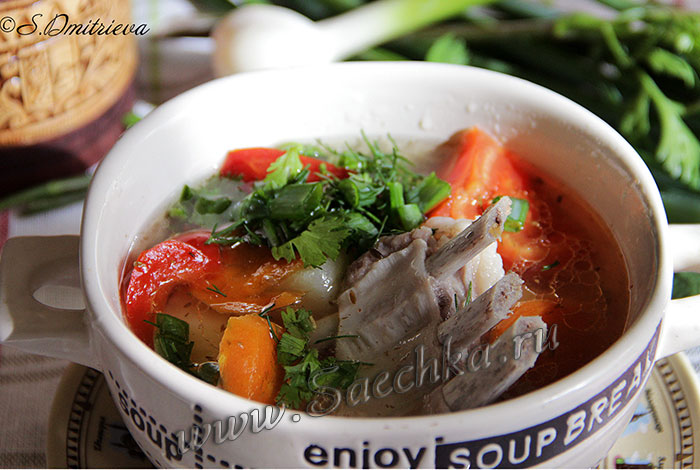 Оооо, какой аромат! Выкладываем в тарелочку кусочки овощей, хороший кусочек баранины, заливаем ароматным бульоном, а сверху посыпаем нарезанной зеленью. За уши не оттащить! А сколько пользы от такого супа!