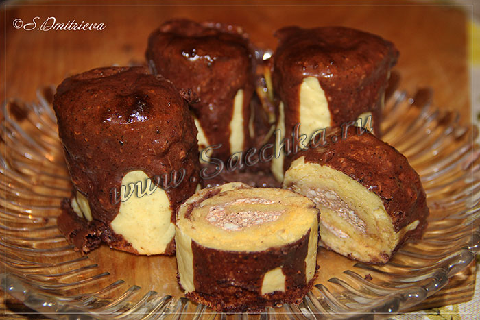- Аккуратно вынуть из формы, промазать начинкой, свернуть рулет.