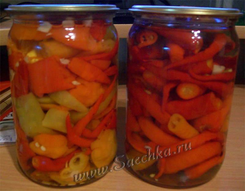 - Разложить острый перец по стерилизованным банкам, добавить до «плечиков» оставшийся рассол и закатать.