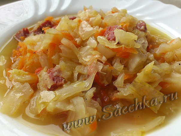 Но все же на самом деле название «солянка» носят два совершенно разных блюда. Супы солянка, рецепты которых можно найти здесь, и второе блюдо "солянка", о которой я сейчас и пишу. По сути, это тушеная капуста с колбасой, но все же тушеная капуста - это тушеная капуста, а у солянки вкус совсем другой - вкуснее и сытнее. Поэтому просто тушеной капустой с колбасой назвать ее язык тоже не поворачивается. Вот так и приходится говорить, что буду готовить солянку и пояснять каждый раз - не ту, которая суп с маслинами, а ту, которая тушеная капуста с колбасой. Что ж делать: когда мы говорим про людей с одинаковыми именами, тоже поясняем - и ничего.