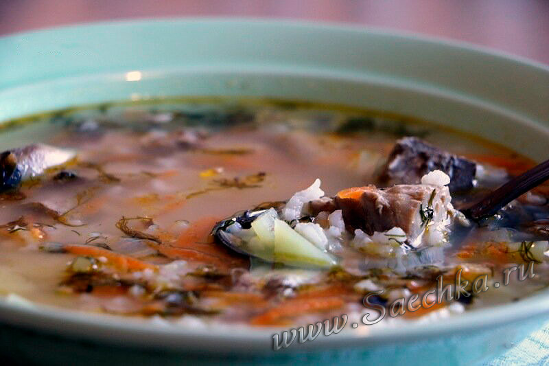 Суп приготовлен из консервированной рыбы - макрели в собственном соку, но можно изменить рецепт, взяв макрель в томате и заменив рис перловкой.