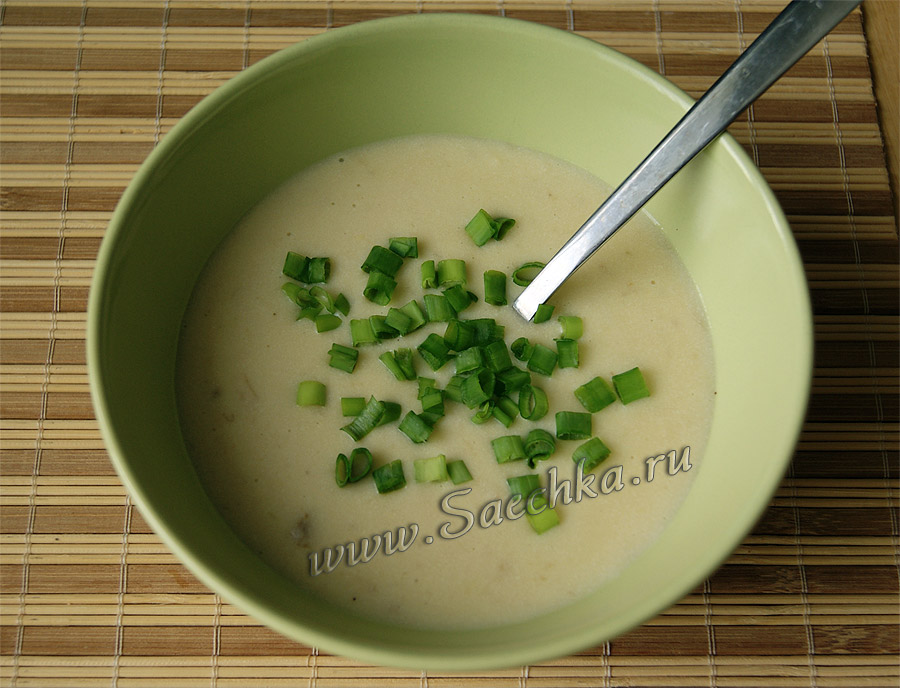 - Дождаться полного растворения сыра и подавать суп-пюре с зелёным луком.