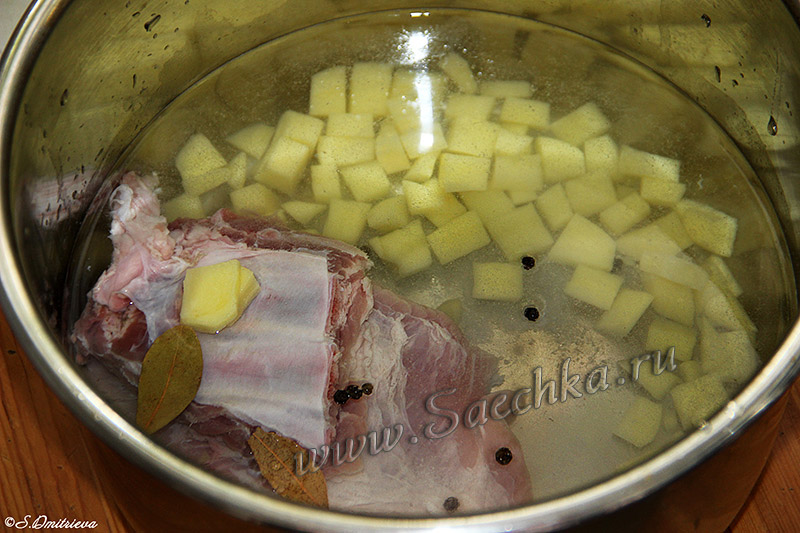 - В чашу мультиварки-скороварки Steba налила воду, положила нарезанный картофель, соль, кусок мяса, лавровый лист, перец. Закрыла крышку, клапан, режим "Суп" на 20 минут.
