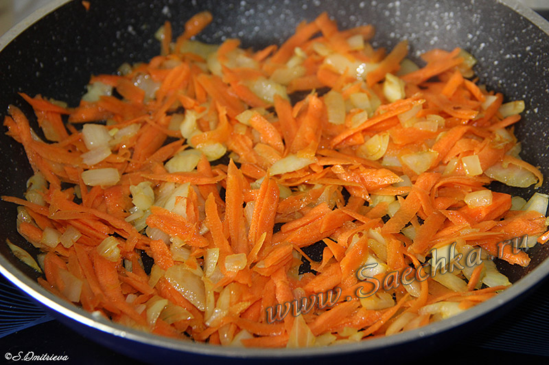 - А в это время нарезала лук, натёрла морковь на крупной тёрке и приготовила пассеровку.