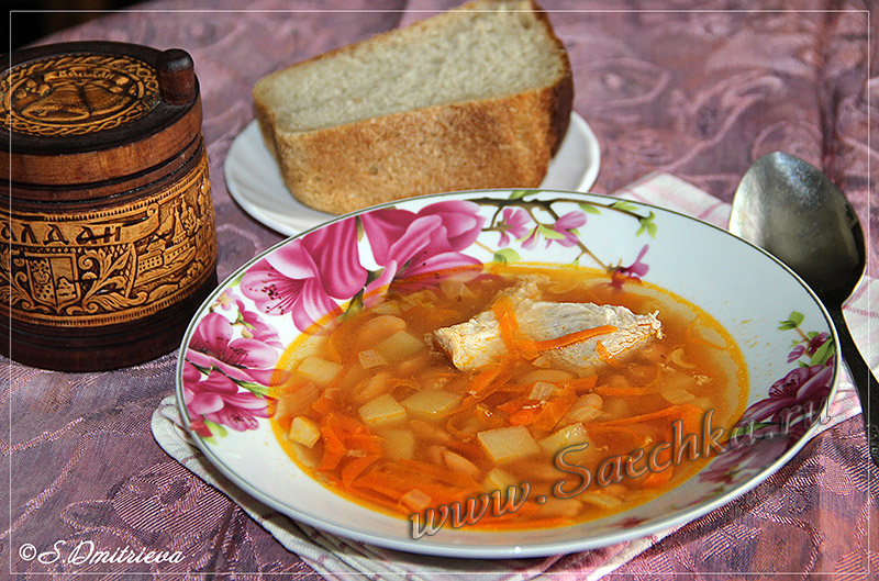 - Когда мультиварка просигналила, стравила пар, открыла крышку, добавила в суп пассеровку и банку консервированной фасоли. И ещё поварила в том же режиме 10 минут.