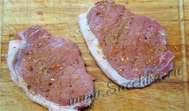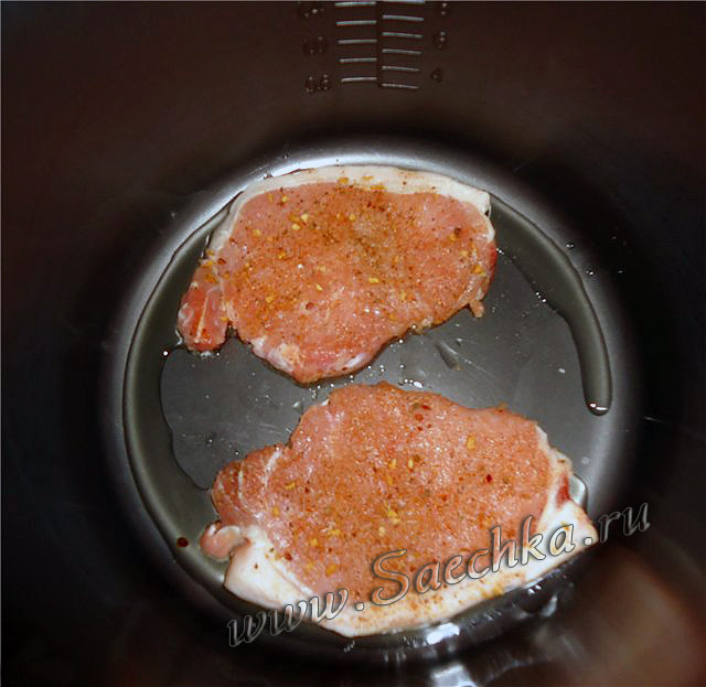 - В чашу мультиварки налить растительное масло без запаха, положить свиные отбивные и жарить: через 13 минут перевернуть, вторую сторону жарить еще 7 минут. За это время они хорошо поджарились.