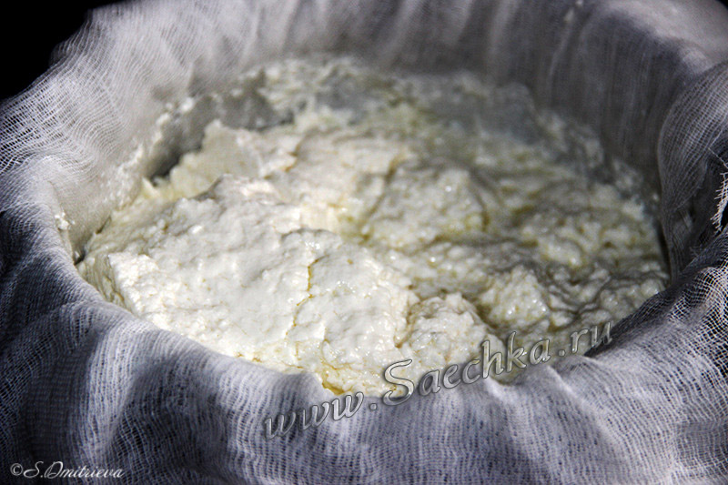 - Затем в дуршлаг положила марлю, сложенную в 4 ряда, водрузила дуршлаг на кастрюлю и аккуратно шумовкой переложила творожок в марлю. На этом этапе можно сыр слегка подсолить, но это уже по желанию.