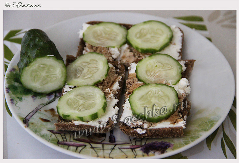 - Поскольку багет тихо уходит из моей жизни, завтракала ржаными многозерновыми горбушками. Сыр пресный и хочется немножко подсолить. На ржаные краюшки намазала домашний сыр, полила соевым соусом и сверху положила кружочки свежего огурца. Вот это было очень вкусно! С утренним кофе очень и очень.