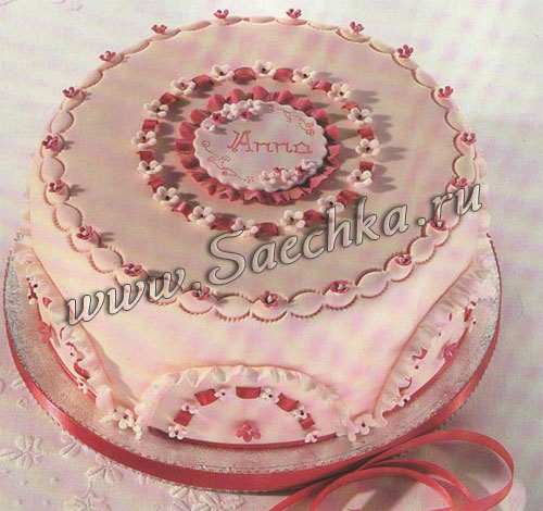- Испеките кекс и дайте ему остыть. Смажьте абрикосовым желе, поместите на поднос и покройте марципаном. Окрасьте сахарную помадку в бледно-розовый цвет при помощи нескольких капель розового пищевого красителя. Нанесите на торт две трети сахарной помадки. Обтяните самой широкой лентой поднос, а самой узкой — основание торта. Закрепите каплей глазури.