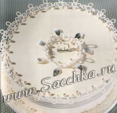 - Отмерьте отрезок узкой серебристой ленточки такой длины, чтобы украсить ею верхний край торта с сахарными фигурками, оставив запас на соединение "внахлестку". Очень осторожно проденьте ленту в отверстия на трилистниках с таким расчетом, чтобы место соединения оказалось не наверху, а под фигурками.