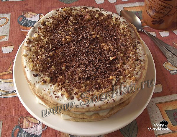 - Сверху торт смазать остатками крема и посыпать тертыми грецкими орехами и шоколадом.