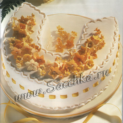 - Украсьте верх торта сахарными цветами, закрепив их королевской глазурью. Несколько разных по величине и оттенкам цветочков разместите на подносе между концами подковы и закрепите королевской глазурью.